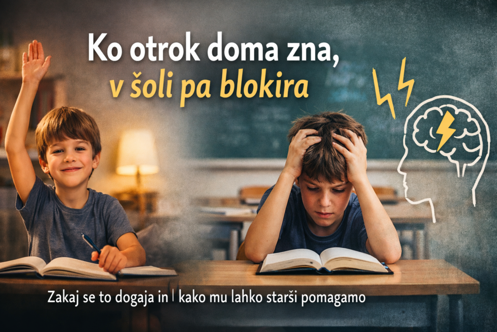 Če otrok doma zna, v šoli pa blokira, to ni dokaz, da ne zna. Pogosto je dokaz, da ga je stres preplavil. Pot iz tega ni v tem, da strahu nikoli več ne bo. Pot je v tem, da otrok dobi izkušnjo, da lahko strah in telesni občutki obstajajo, on pa kljub temu deluje.